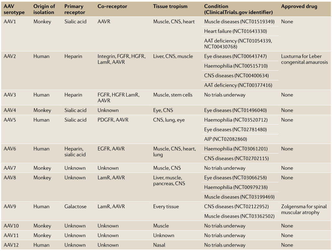 表1.不同AAV血清型的特性和临床运用