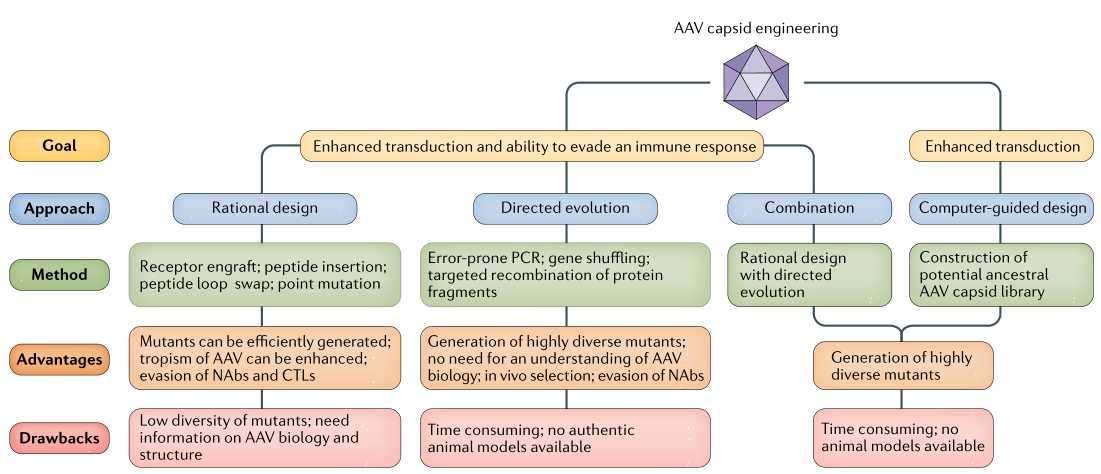 目前主要有三种技术来改造AAV衣壳:合理设计、定向进化和计算设计天然衣壳。