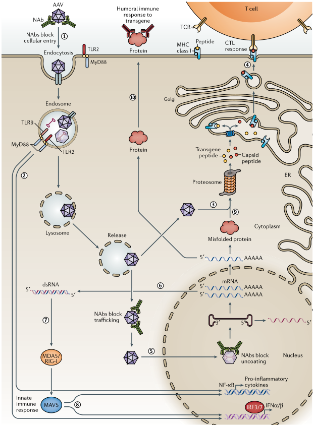 AAV病毒颗粒与细胞表面受体结合发生内吞作用。Toll样受体2(TLR2)和TLR9也存在于细胞表面或细胞内感知AAV。当树突状细胞被AAV侵染后,TLR9诱导先天免疫反应的发生,scAAV载体比传统的单链AAV载体诱导更强的先天免疫反应。当AAV基因组元件被设计成减少TLR9对病毒基因组CpG位点的识别时,可以避免激活TLR9介导的先天免疫反应。
