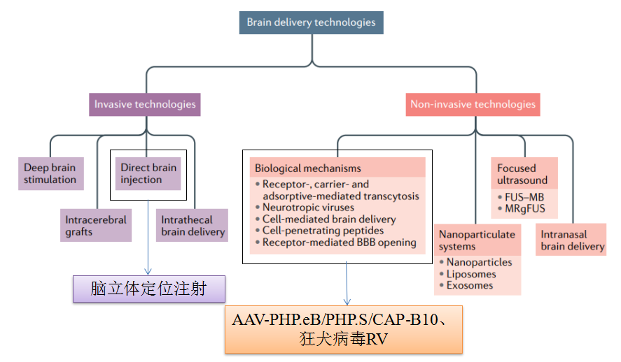在治疗中枢神经系统疾病的药物开发中,实现充分的跨血脑屏障传递是一个关键的挑战。大脑传递技术大致分为侵入性和非侵入性技术。如脑深部刺激、直接大脑注射等侵入性方式,及纳米颗粒系统、经鼻腔靶向脑递送系统、病毒载体系统(利用AAV-PHP.eB/PHP.S/CAP-B10、狂犬病毒RV)等非侵入性方式。