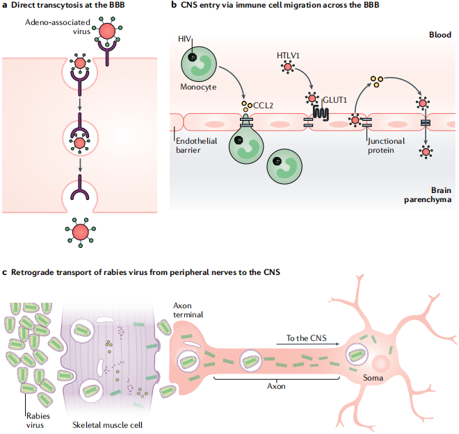 图3. 病毒跨血脑屏障机制(Terstappen GC, Meyer AH, Bell RD, et al. Nat Rev Drug Discov. 2021.)