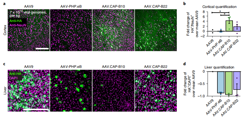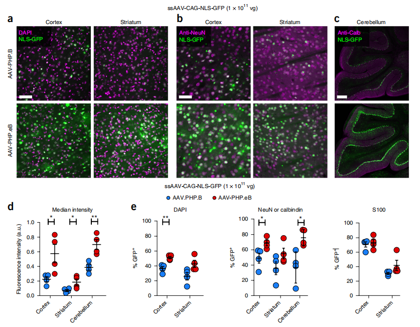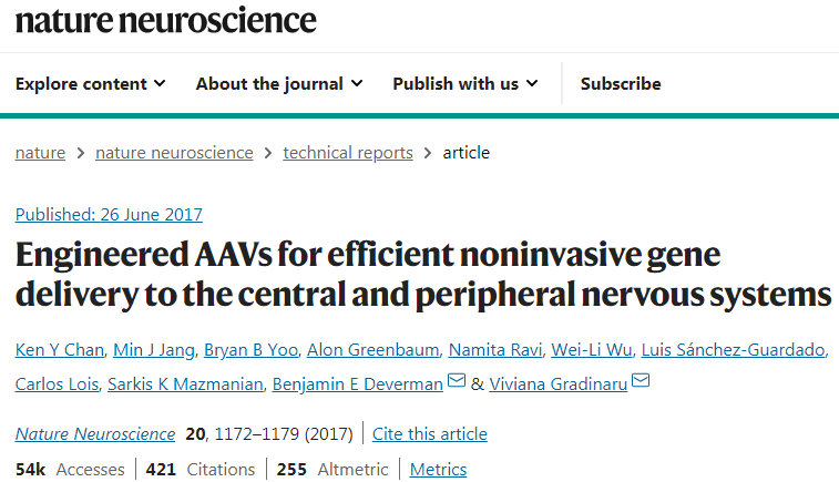 [2]Chan KY, Jang MJ, Yoo BB, et al. Engineered AAVs for efficient noninvasive gene delivery to the central and peripheral nervous systems. Nat Neurosci. 2017 Aug;20(8):1172-1179.
