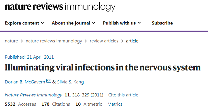但是随着新的嗜神经病毒不断出现,中枢系统由于缺乏对新病毒的免疫记忆,对这些新病毒免疫抑制作用相对较弱,造成病毒的迅速传播并诱发严重的神经病理反应。因此,小编在这里给大家推荐McGavern DB和Kang SS发表在《Nature reviews Immunology》题为“Illuminating viral infections in the nervous system”的综述文章,本综述除了重点描述病毒进入和在神经系统内传播的主要策略外,还关注在病毒持续复制和潜伏状态期间的神经系统和免疫系统之间建立的对话方式。最后讨论如何使用双光子激光扫描显微镜(TPLSM)观察中枢系统的先天免疫细胞在急性病毒感染后的免疫保护和损害机制。