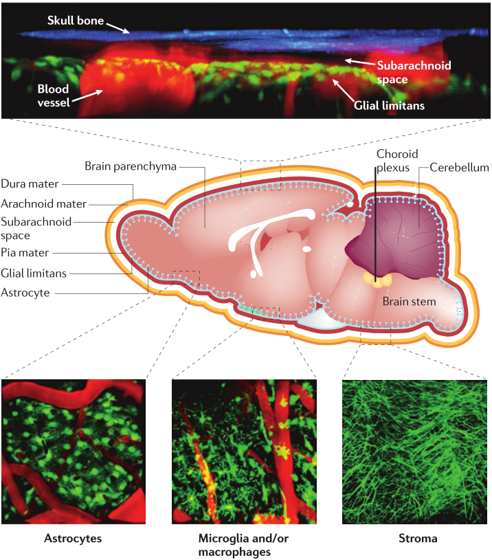 维持中枢神经系统内的稳态对于神经元和大脑功能至关重要。血脑和血脑脊液屏障有助于保护中枢神经系统免受循环系统成分的影响。大多数的脑血管都由紧密连接的内皮细胞组成,限制细胞和分子通过内皮间隙扩散到脑实质中。内皮细胞还通过产生由层粘连蛋白α4和层粘连蛋白α5组成的基底膜,为血管周围空间提供物理屏障。沿着血管分布的平滑肌细胞调节血管张力,而周细胞(一种包围全身毛细血管和静脉中内皮细胞的细胞)可以在发育过程中维持和整合血脑屏障成分。在脑实质内,血管旁的小胶质细胞和血管周围的巨噬细胞与血管内皮紧密并列,并有可能与浸润的白细胞相互作用。星形胶质细胞还通过形成神经胶质界限和星形胶质细胞末端的致密网络来维持血脑屏障系统。