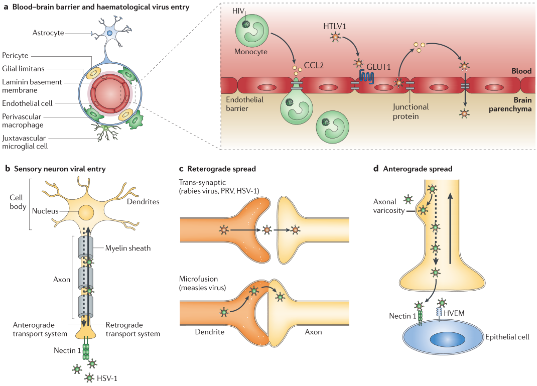 病毒到达中枢神经系统后,通过许多不同的机制来促进细胞间的传播。首先病毒可以通过释放到突触间隙或通过与邻近神经元的融合进行传播。甲型疱疹病毒入侵神经元后通过顺行运输系统,从神经元胞体移动到轴突终末,通过胞吐从突触前的终末释放到突触裂隙,感染邻近的细胞神经元。狂犬病病毒入侵神经元后,以逆轴浆运输的方式在神经元以逆行的方式传播。