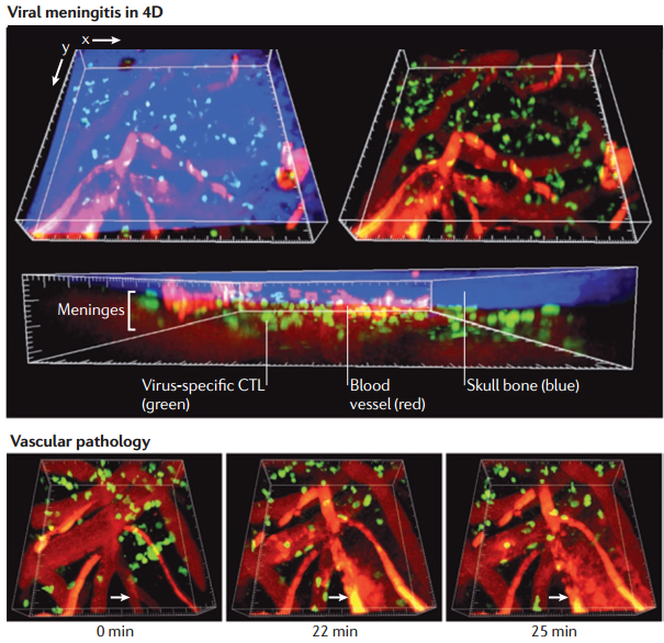 一旦病毒进入中枢神经系统,就必须考虑其发病机制,而实时成像在这方面大有用途。TPLSM可以在脑实质微环境中对不同病毒入侵响应的固有免疫细胞进行精细化研究。