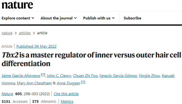 小编在这里给大家推荐我司客户美国西北大学范伯格医学院麻醉科García-Añoveros J教授和Anne Duggan教授团队于2022年5月4日在线发表于《Nature》的研究论文。OHCs的一种转录因子INSM1在关键的胚胎期起巩固OHCs命运的作用,可防止OHCs转分化为IHCs。在没有INSM1的情况下,胚胎OHCs错误表达一组核心IHCs特异性基因,而这些基因经作者预测与IHCs分化有关。作者还发现其中一个基因Tbx2是小鼠IHCs与OHCs分化的主要调节因子。敲除胚胎IHCs中的Tbx2导致其发育为OHCs,表达早期OHCs标记物,如Insm1,在IHCs的位置上最终成为完全成熟的OHCs。此外,Tbx2对Insm1具有上位性:在两个基因都缺失的情况下,耳蜗只产生OHCs,这表明TBX2对于INSM1缺陷OHCs向IHCs的异常转分化以及正常IHCs分化是必要的。在出生后分化程度较大的IHCs中敲除Tbx2,使其直接转分化为OHCs,用成熟和非胚胎OHCs的特征取代IHCs特征。最后,Tbx2在OHCs中的异位表达导致其转分化为IHCs。因此,Tbx2对于使IHCs区别于OHCs来说既是必要的,也是充分的,并在整个发育过程中保持这种差异。