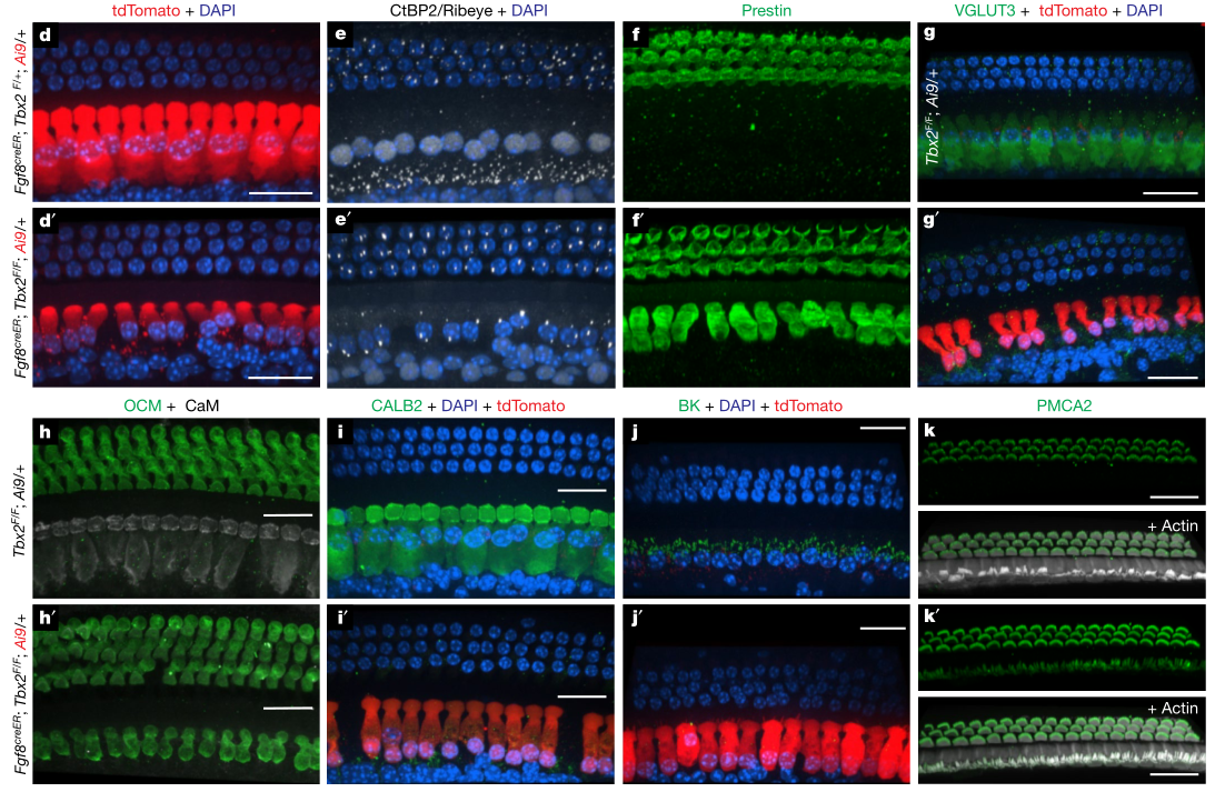 由于胚胎期敲除Tbx2会造成IHCs中Tbx2表达永久性降低,不利于研究IHCs分化的晚期是否需要Tbx2的参与。因此研究人员采用他莫昔芬启动的Cre-loxp技术,转基因小鼠在P0、P3、P7和P9的时间点单次注射他莫昔芬后,在不同时间段敲除Tbx2均会导致IHCs向OHCs的转分化。随着时间的推移,IHCs标记分子VGLUT3、CALB2、BK和CtBP2的表达明显降低;而OHCs标记分子prestin、oncomodrin和PMCA2的表达明显增加。