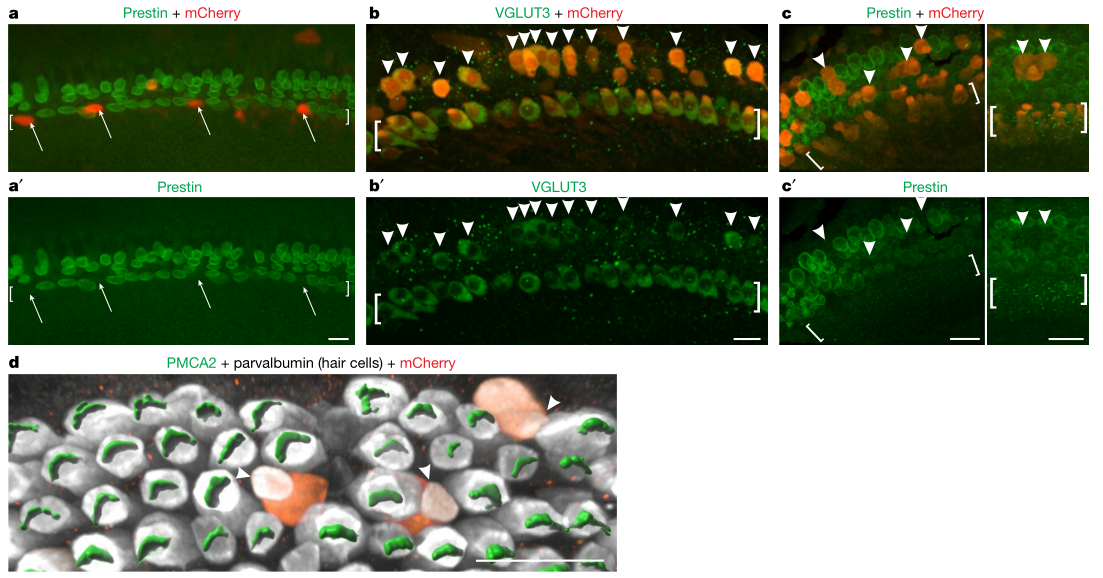 构建AAV-TBX2-IRES-mCherry病毒(AAV载体为感染毛细胞的Anc80血清型),通过病毒感染在发育期的毛细胞中特异性表达Tbx2。研究首先在IHCs敲除Tbx2的细胞中部分恢复表达Tbx2,发现敲除Tbx2之后,IHCs转分化形成OHCs,但是在恢复Tbx2表达的IHCs无法转分化形成OHCs。随后将AAV病毒注射到耳蜗OHCs所在的位置上,发现AAV病毒表达的OHCs出现IHCs的分子标记物Vglut3,而OHCs自身的分子标记物Prestin和PMCA2表达显著减少,在OHCs中过表达Tbx2有利于OHCs转分化形成IHCs。因此,Tbx2是耳蜗毛细胞分化形成IHCs的充分且必要条件,Tbx2是决定毛细胞向IHCs或OHCs分化的主要调节因子。