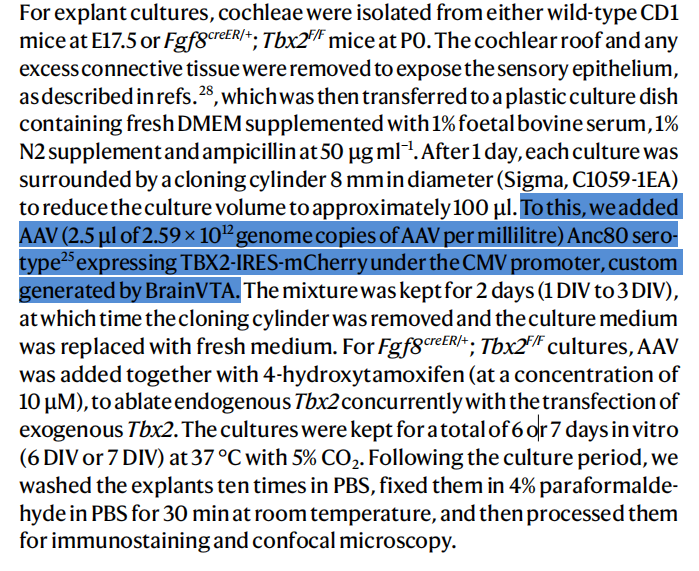 本文利用AAV-Anc80构建Tbx2过表达病毒载体靶向感染毛细胞,用于在发育中的耳蜗培养物中异位表达Tbx2。我司可制备Anc80血清型AAV载体,欢迎咨询!