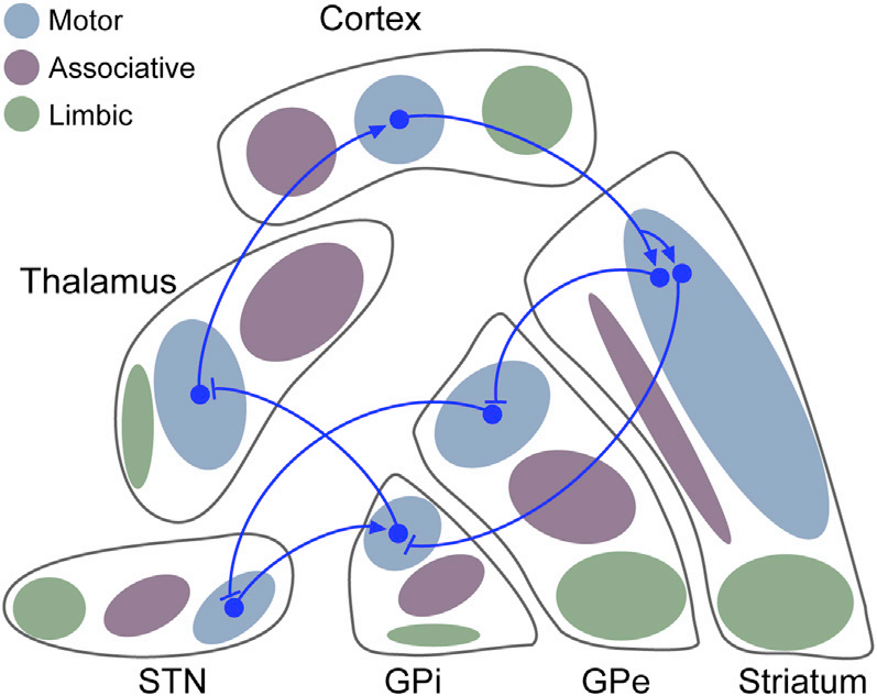并联环路模型主要阐述信息如何在基底神经节的不同环路进行传递。基底神经节的主要输入神经元是来源于纹状体的中等棘状神经元(Medium Spiny Neurons, MSNs,也叫棘状投射神经元/SPNs)、来源于皮质和丘脑的谷氨酸能神经元和来自中脑区域的多巴胺能神经元。该模型提出不同类型的信息(感觉,运动,联想)在通过并联的方式在基底神经节-丘脑-皮质环路中进行传递。