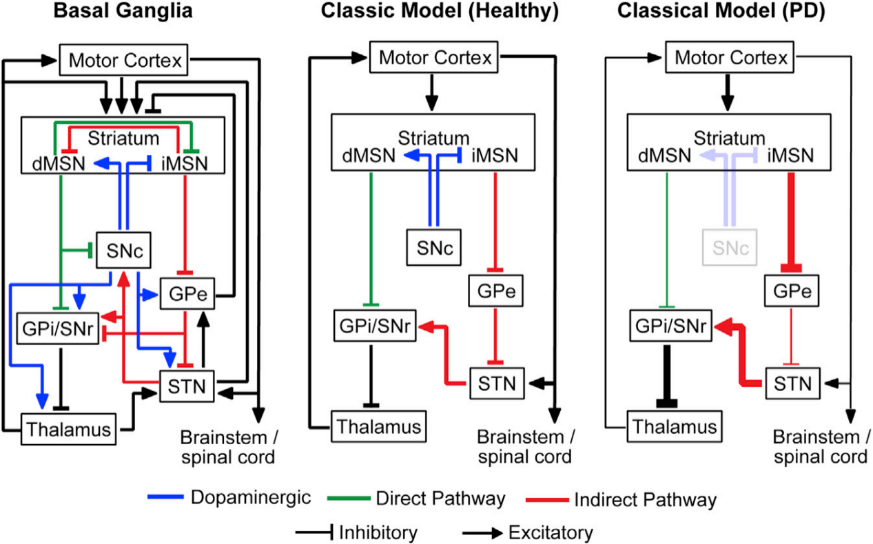 基底神经节经典模型主要侧重于解释多巴胺是如何调节运动功能,以及中脑多巴胺能神经元丢失后导致PD运动症状发生的环路机制。经典模型将纹状体MSNs分为两个群体,直接通路和间接通路的MSNs。直接通路MSNs(dMSNs)直接投射到基底神经节输出端(GPi/SNr)并表达有D1类多巴胺受体。直接途径的激活减少了基底神经节的输出,解除对丘脑神经元的抑制作用并促进运动的产生。