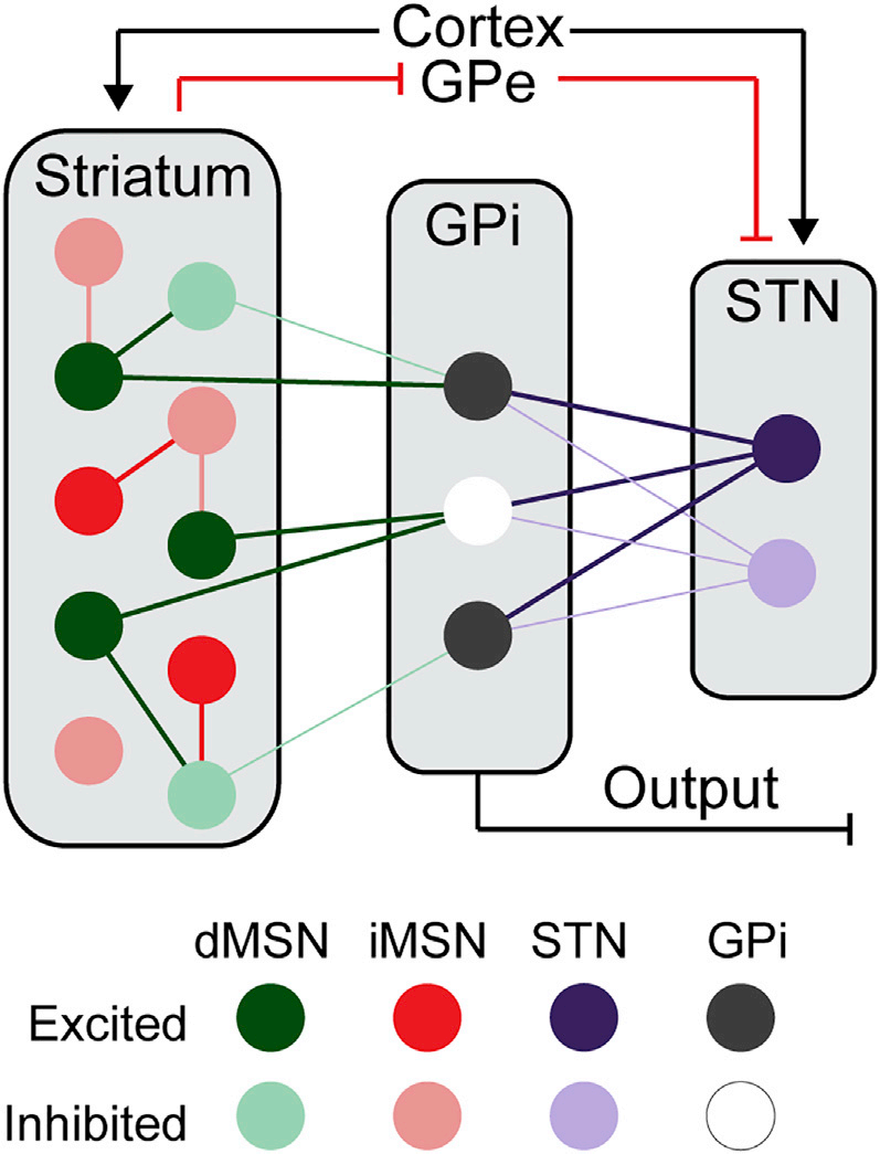 纹状体的中等棘状神经元是GABA能神经元,可通过直接或间接的方式,投射到基底神经节输出核、苍白球内部(Globus Pallidus Pars Interna, GPi)和黑质网状(Substantia Nigra Pars Reticulata, SNr)。间接投射是通过苍白球外侧部(Globus Pallidus Pars Externa, GPe)中的GABA能神经元和丘脑底核(Subthalamic Nucleus, STN)中的谷氨酸能神经元,共同调节GPi投射到SNr的神经元。GPi向SNr的投射神经元能抑制脑干的运动中心。