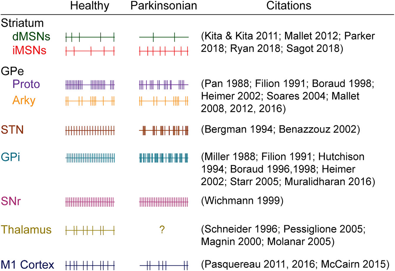 目前科学界已经从非人灵长类的PD模型中总结出了基底神经节速率模型。通过注射1-甲基-4-苯基-1,2,3,6-四氢吡啶(MPTP)诱导PD的发生。在PD的非人灵长类动物和PD患者的细胞外记录中显示GPi神经元(iMSNs)的平均放电增加,表明PD可能是由于基底神经节输出过多引起。