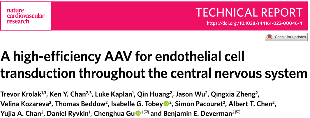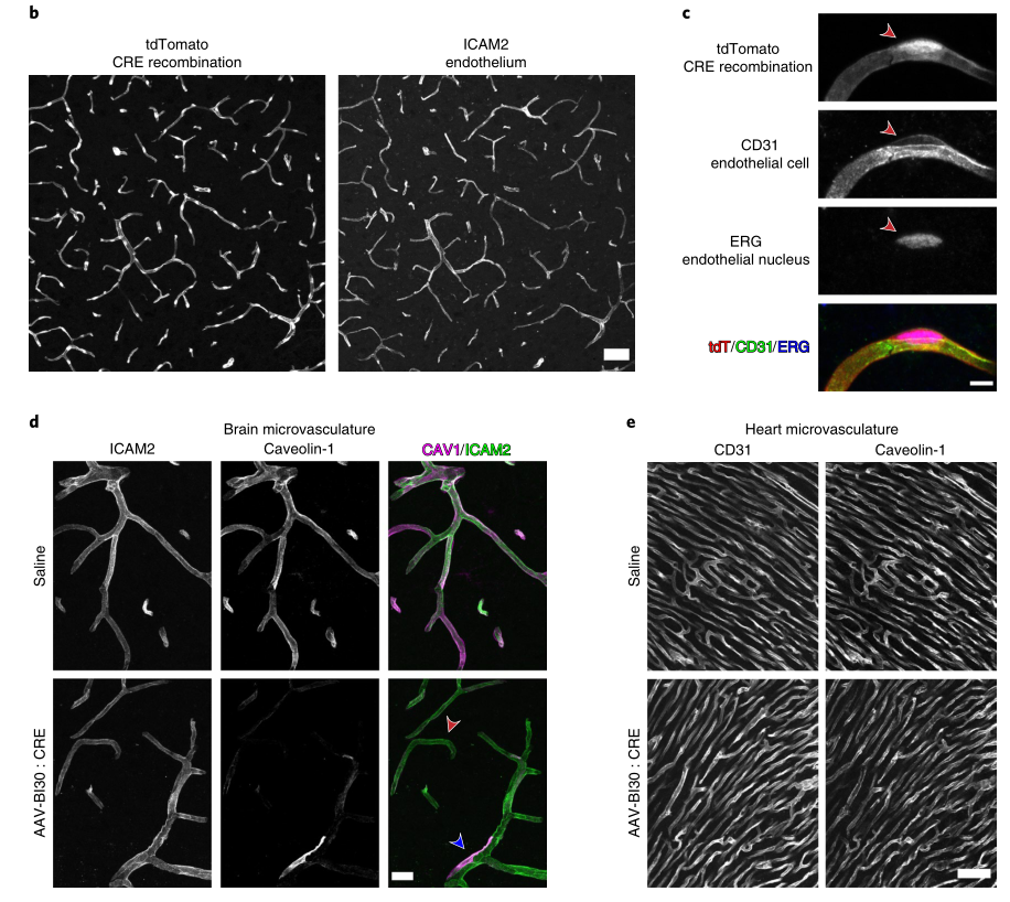 因此,小编在这里给大家推荐哈佛医学院神经生物学顾成华教授联合美国麻省理工学院、哈佛大学博德研究所Benjamin E. Deverman教授发表于《nature cardiovascular research》的研究论文“A high-efficiency AAV for endothelial cell transduction throughout the central nervous system”。作者研发出一类AAV9工程化的病毒衣壳—AAV-BI30,这是一种在中枢神经系统中特异而高效地转导内皮细胞的衣壳。在相对较低的全身剂量下,该载体可转导成年C57BL/6小鼠大脑、视网膜和脊髓脉管系统中的大多数动脉、毛细血管和静脉内皮细胞。此外,研究人员还表明AAV-BI30在体内对多种小鼠品系和大鼠内皮细胞,在体外对人脑微血管内皮细胞都有较强的转导能力,可实现跨物种的特异性表达。最后,作者还证明了AAV-BI30在中枢神经系统中实现高效和内皮特异性Cre介导的基因操纵的能力。这使得AAV-BI30非常适合解决神经血管生物学中突出的研究问题,有利于加深对正常生理中神经血管相互作用的认识,以及开发相关中枢疾病中治疗内皮功能障碍的药物。