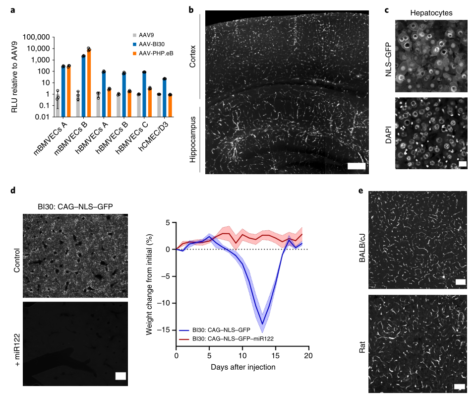但是AAV-BI30对于肝细胞有较高的趋向性,并且导致肝细胞的形态异常。为了降低AAV-BI30对肝细胞的损伤,研究人员在病毒中加入肝特异性的miR-122重复序列,该载体在降低病毒肝脏趋向性的同时,保留了脑微血管内皮细胞的特异性表达。