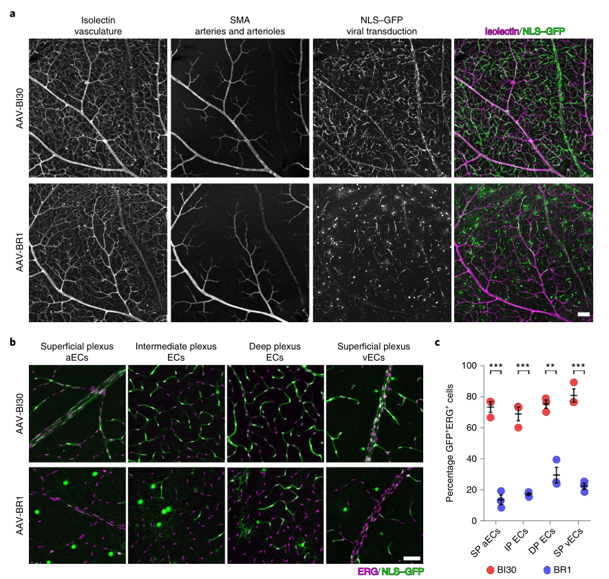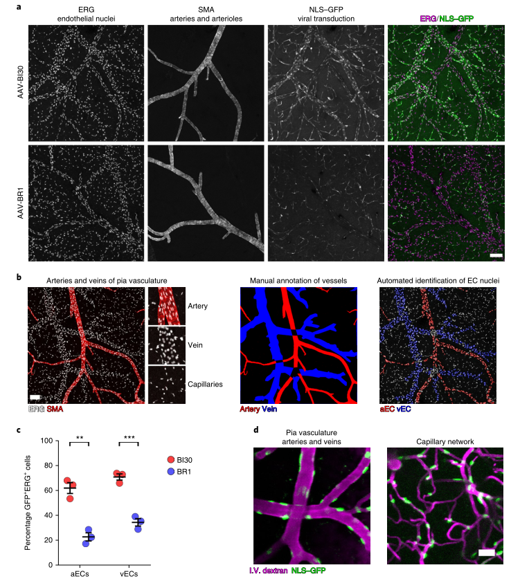 为了研究AAV-BI30在脑微血管内皮细胞中的感染效率,研究人员设计了一种特殊的分析方案,即通过病毒的NLS-GFP和内皮特异性转录因子ERG的共定位来评估AAV-BI30的感染效率,该方案能快速识别出脑血管的单个内皮细胞。通过与AAV-BR1的对比,发现两类病毒均有明显的脑微血管内皮细胞的趋向性,但是AAV-BI30在微血管内皮细胞的感染效率明显优于AAV-BR1。