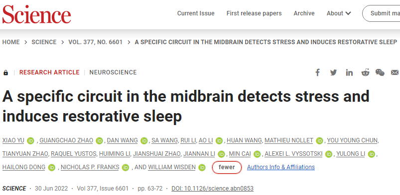 北京时间2022年7月1日,空军军医大学第一附属医院董海龙教授课题组和英国伦敦帝国学院William Wisden & Nicolas P. Franks课题组联合在《Science》杂志在线发表Article“A specific circuit in the midbrain detects stress and induces restorative sleep”,揭示了社交挫败应激后的睡眠在加速机体撤离应激状态中的重要作用,描绘了由中脑腹侧被盖区(VTA区)引发恢复性睡眠的神经网络机制,并深入阐明该系统经睡眠调控缓解压力后异常焦虑的重要过程。