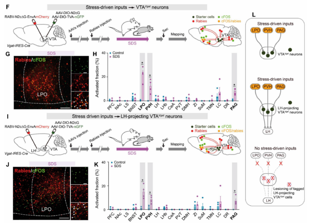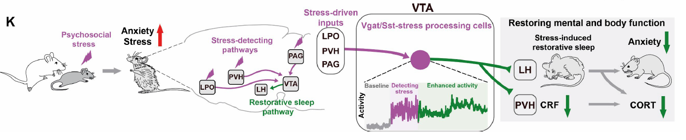 神经束路示踪技术显示,VTA区响应社交挫败应激的神经元接受来自外侧视前区(LPO)、下丘脑室旁核(PVH)以及导水管周围灰质(PAG)的神经投射,并投射到外侧下丘脑(LH)以及PVH,提示以VTA区GABA能神经元为中心的神经网络在应激后恢复性睡眠中的调控作用。特异性激活负责应激响应的VTA区SST神经元及其向下游脑区外侧下丘脑(Lateral Hypothalamus,LH)的神经投射,可以显著促进睡眠,而特异性敲除该群神经元则消除其恢复性睡眠功能,以上发现证实了VTA区SST神经元至LH区的神经环路介导了社交挫败应激后的恢复性睡眠的产生。