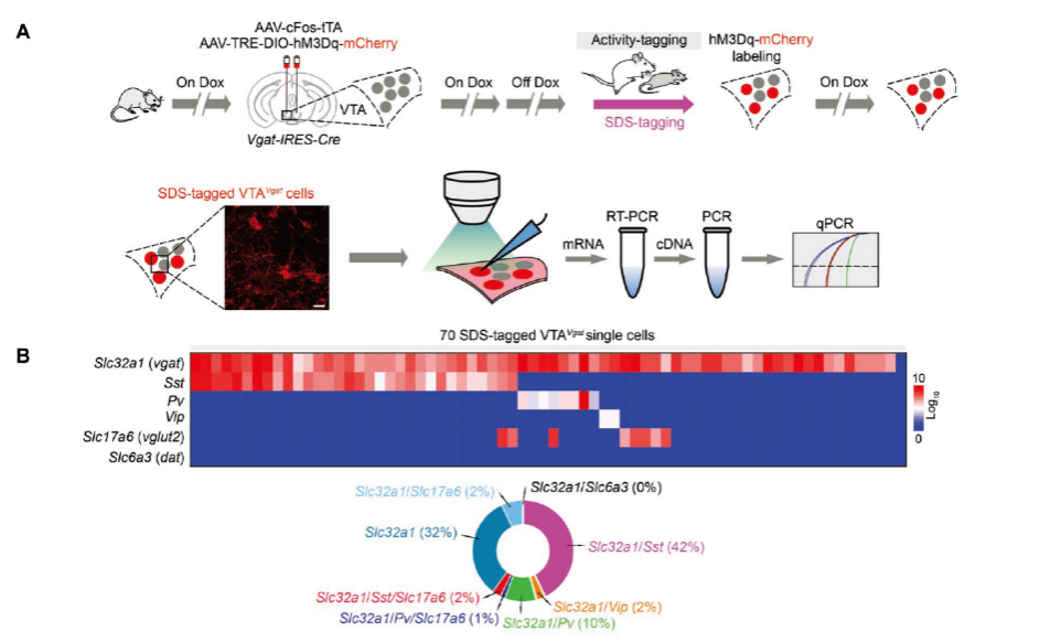 为阐明应激后恢复性睡眠产生的神经生物学机制,研究人员关注了在应激响应以及睡眠-觉醒调控中均具有重要作用的脑区——中脑腹侧被盖区(Ventral Tegmental Area,VTA)。进一步应用单细胞RNA-seq技术识别急性应激刺激后活性持续增加的VTA区生长抑素(Somatostatin,SST)阳性的GABA能神经元,并联合应用一种TetTag-DREADDs活性依赖的转基因标记体系及遗传学调控策略,验证应激激活的VTA区GABA能神经元可以显著缩短睡眠潜伏期,延长睡眠时间,特异性抑制这群神经元可使得SDS后的恢复性睡眠减少。
