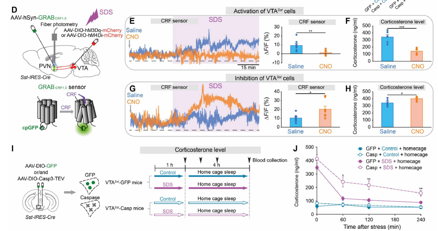 为明确恢复性睡眠发挥保护性作用的机制,研究人员利用束路追踪技术寻找到VTA区SST神经元的另一个下游投射脑区——下丘脑室旁区(PVH)。PVH区神经元既往被认为通过释放促皮质激素释放因子(CRF)参与应激应答,提示VTA区SST神经元可能通过调控PVH的CRF能系统从而具备调控机体皮质酮水平的潜能。因此,研究者利用新型基因编码的CRF荧光探针(GRAB CRF1.0)发现并证实激活VTA区SST神经元可以显著降低社交挫败应激引起的脑内CRF含量升高,而敲除VTA区SST神经元显著破坏了恢复性睡眠降低皮质酮水平的作用。上述结果证实了VTA区SST阳性GABA神经元主导了社交挫败应激后恢复性睡眠的产生,恢复性睡眠有助于缓解焦虑,降低机体皮质酮水平。