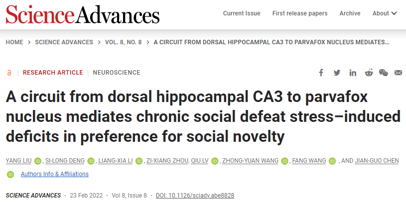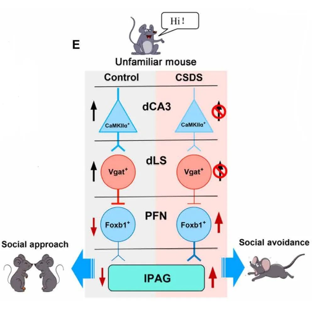 本文使用了多种转基因小鼠,结合光遗传学、光纤钙成像和脑片膜片钳技术,利用多种神经示踪病毒载体,发现dCA3的兴奋性神经元→dLS的GABA能神经元→PFN的Foxb1+阳性神经元→lPAG神经环路对社交新颖性偏好的调节作用,并阐明了慢性社会挫败应激通过dCA3的兴奋性神经元影响社交新颖性偏好的机制。