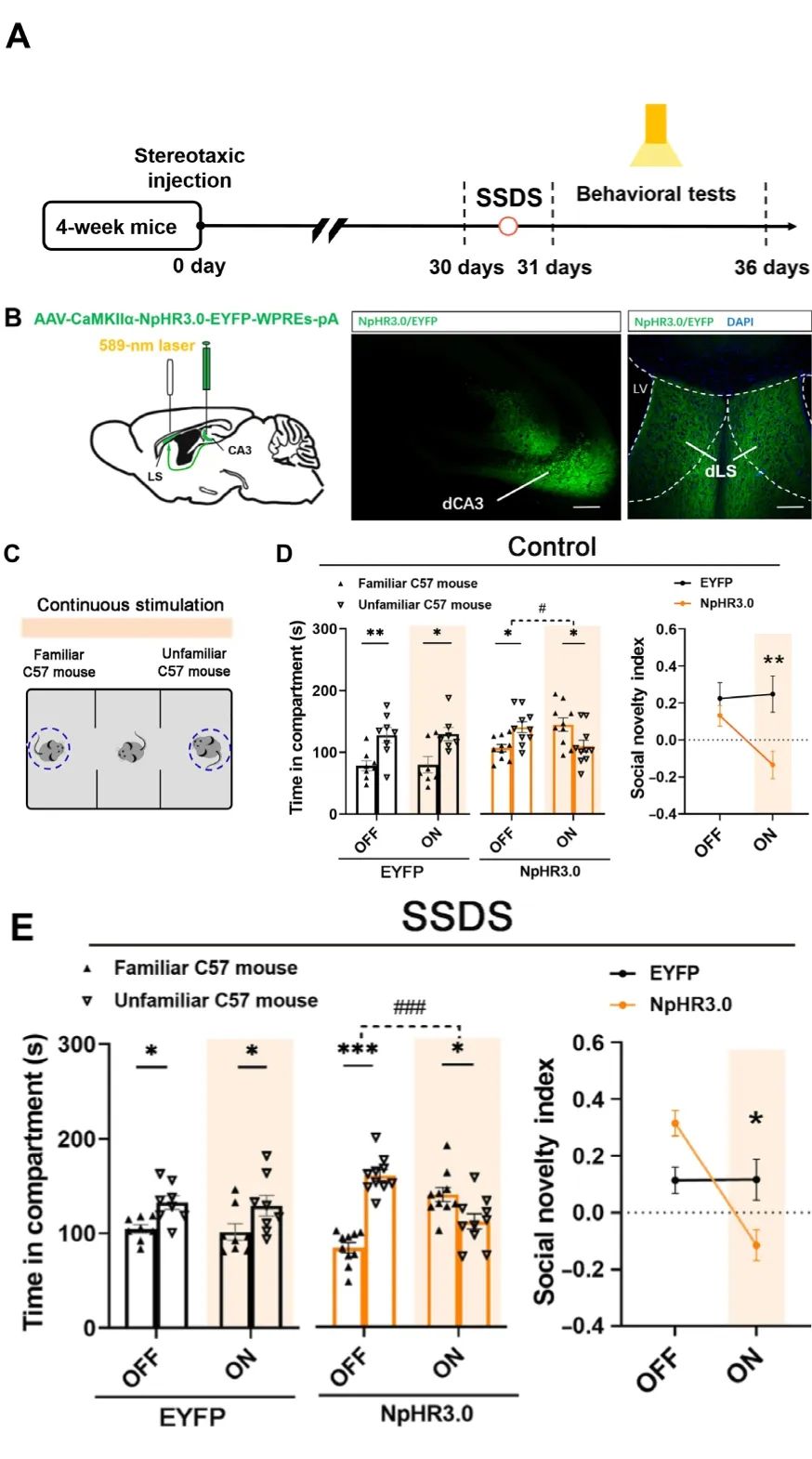 以dCA3兴奋性神经元为起点,通过顺行环路示踪对其下游脑区进行筛选,发现背外侧隔核(dLS)有着密集的dCA3兴奋性神经元投射,因此dLS有可能是dCA3的下游效应脑区。通过光遗传学技术发现抑制dCA3→dLS环路会损伤小鼠社交新颖性偏好。光遗传学激活这一环路会逆转CSDS引起的社交新颖性损伤。