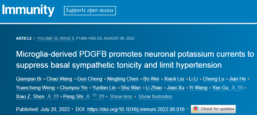 尽管许多研究已经揭示了影响神经元活动的调控环路,但决定神经元兴奋性的局部非突触机制尚不清楚。2022年7月22日浙江大学医学院基础医学系谷岩教授、浙大医学院附属第二医院Shen Xiao Z.教授、浙大转化医学研究院史鹏教授作为通讯作者联合在免疫学顶尖期刊《Immunity,IF=43.474》发表研究论文“Microglia-derived PDGFB promotes neuronal potassium currents to suppress basal sympathetic tonicity and limit hypertension”,本研究中作者发现小胶质细胞在稳态时阻止了下丘脑室旁核(PVN)前交感神经元的过度激活,小胶质细胞组成性释放血小板衍生生长因子(PDGF)B,PDGFB通过神经元细胞上的PDGFRα发出信号并促进Kv4.3的表达,而Kv4.3是传导钾电流的关键亚单位。消除小胶质细胞、条件性缺失小胶质细胞PDGFB或抑制PVN中神经元PDGFRα表达提高了前交感神经元的兴奋性和交感神经流出,导致严重的自主神经功能障碍。破坏PDGFBMG-Kv4.3Neuron通路使小鼠易患高血压,而外源性PDGFB的中枢补充抑制了小鼠在高血压损伤下的升压反应。总而言之,这些结果表明,驻留的小胶质细胞在维持交感神经流出的平衡方面具有非免疫作用,在维持神经元兴奋性和外周自主神经功能的动态平衡中起着重要作用,对预防心血管疾病非常重要。