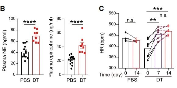通过在Itgam启动子控制下表达人白喉毒素(DT)受体的转基因小鼠(CD11b-DTR)侧脑室中注射DT,发现能消除绝大部分下丘脑室旁核(PVN)的小胶质细胞。注射DT的小鼠血浆中去甲肾上腺素(NE)和肾上腺素的水平明显增加,小鼠的心率明显上升,表现出交感神经张力升高。