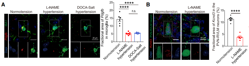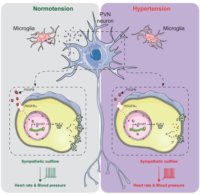 本文运用多种类型的转基因鼠,通过免疫荧光、病毒干预技术、脑片膜片钳、生理指标检测等手段,发现PVN脑区的小胶质细胞通过释放PDGFB作用于PVN-RVLM神经元的PDGFRα,促进Kcnd3的表达,增加Kv4.3钾通道的上膜,抑制前交感神经元的兴奋性,防止高血压的病理进程。