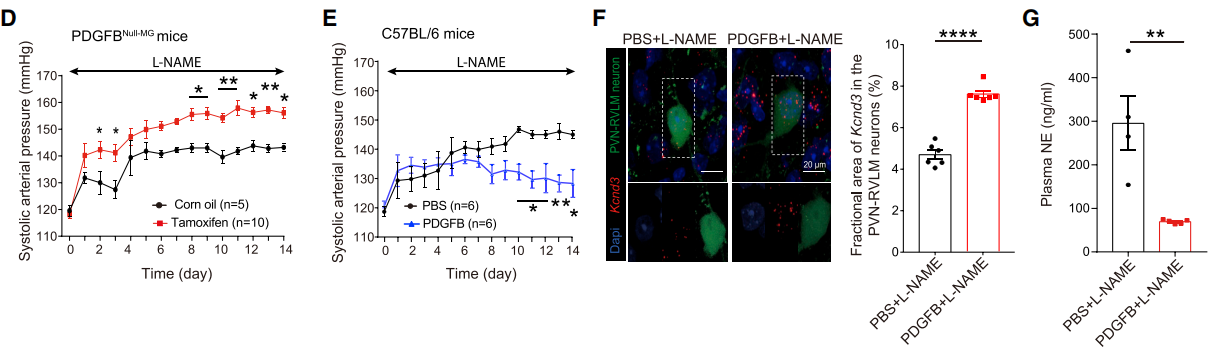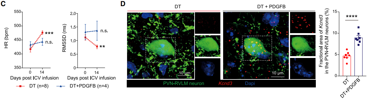 对N-硝基-L-精氨酸甲酯(L-NAME)和醋酸脱氧皮质酮(DOCA)诱导的高血压模型小鼠进行检测,发现高血压小鼠PVN脑区的小胶质细胞PDGFB的表达明显降低,PVN-RVLM神经元的Kcnd3表达明显减少,交感输出明显增加。敲除小胶质细胞的PDGFB促进高血压的病程。而外源性给予PDGFB能增加小胶质细胞的PDGFB表达以及PVN-RVLM神经元中的Kcnd3表达,降低交感神经的兴奋性,从而改善自主神经功能。