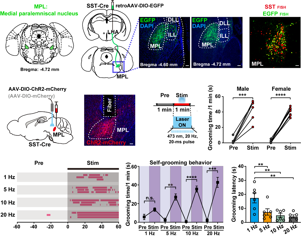 研究人员首先利用光遗传学方法激活位于中脑的内侧脑桥旁核MPL中的兴奋性SST神经元,发现能够诱发小鼠强烈的自我理毛行为。这一行为在雌性小鼠和雄性小鼠中都能诱发。并且光刺激60秒内随着刺激频率升高理毛行为持续时间变长,而光刺激时理毛行为出现的延迟期随着光刺激频率的上升而减少,在20赫兹刺激频率时延迟期大约为4秒。