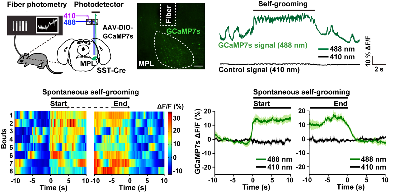 接下来研究人员检测了小鼠执行理毛行为时MPLSST神经元的活动情况。光纤钙信号记录显示MPLSST神经元具有与理毛行为强相关的神经元活动,参与理毛行为的启动和维持(图2)。