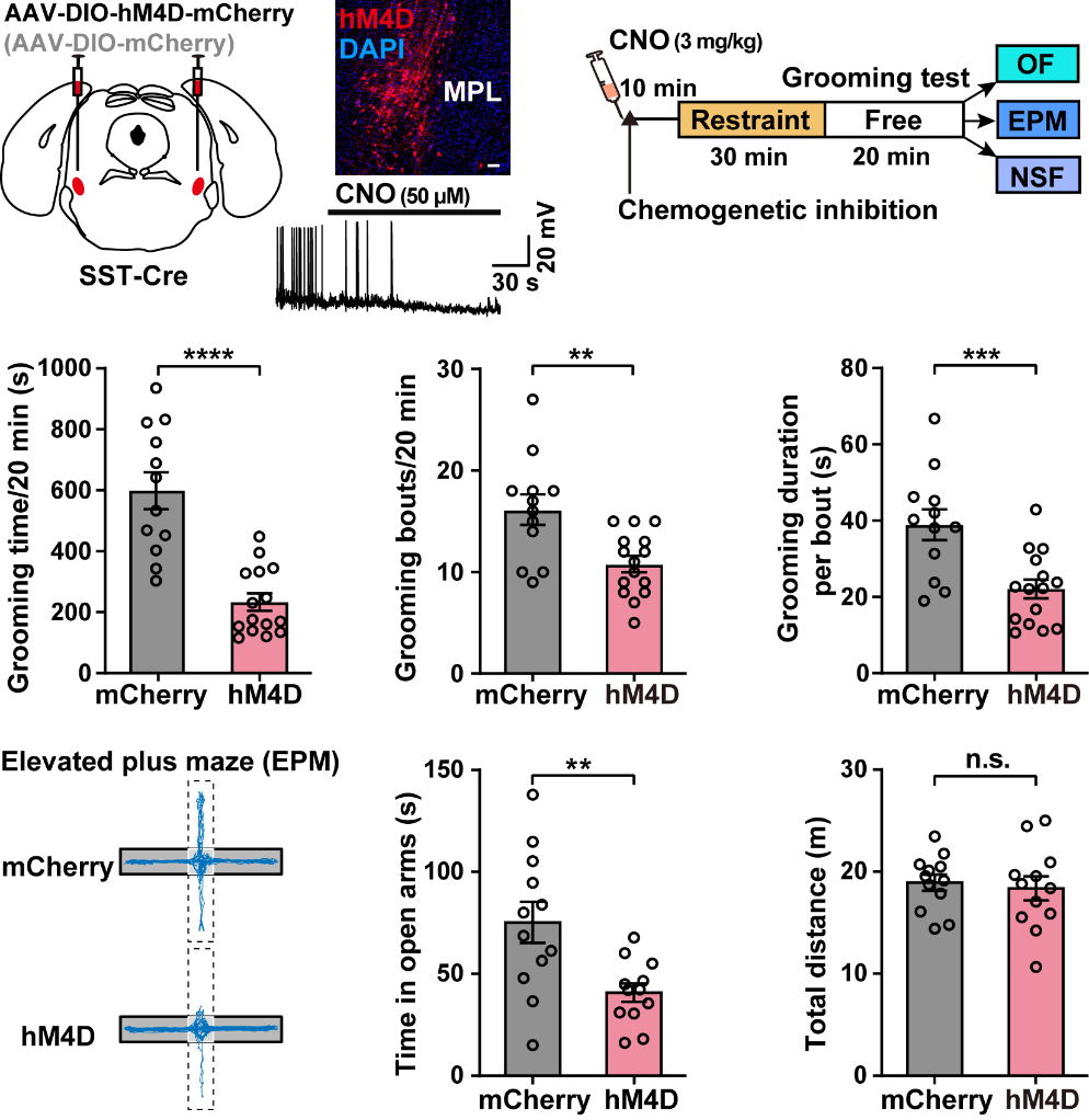 压力会显著诱发小鼠的理毛行为并诱发小鼠焦虑情绪,研究人员接下来利用化学遗传学方法双侧抑制MPLSST神经元来观察压力后小鼠理毛行为的变化以及对小鼠焦虑情绪的影响。研究人员发现,抑制MPLSST神经元后不仅显著减少小鼠压力诱导的重复自我理毛行为,还损害了小鼠应对压力刺激的焦虑缓解能力(图3)。