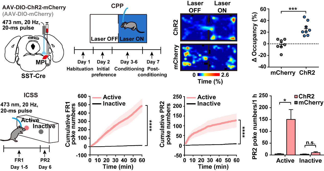 对于控制刻板重复行为神经环路的情绪效价以前的研究有相悖的结论,本论文中研究人员也对激活MPLSST神经元的效价进行了探索。通过条件性位置偏好实验和颅内自刺激驱动强化实验进一步发现,光激活MPLSST神经元显著关联正性情绪效价,产生奖励效应,并且驱动强化(图4)。