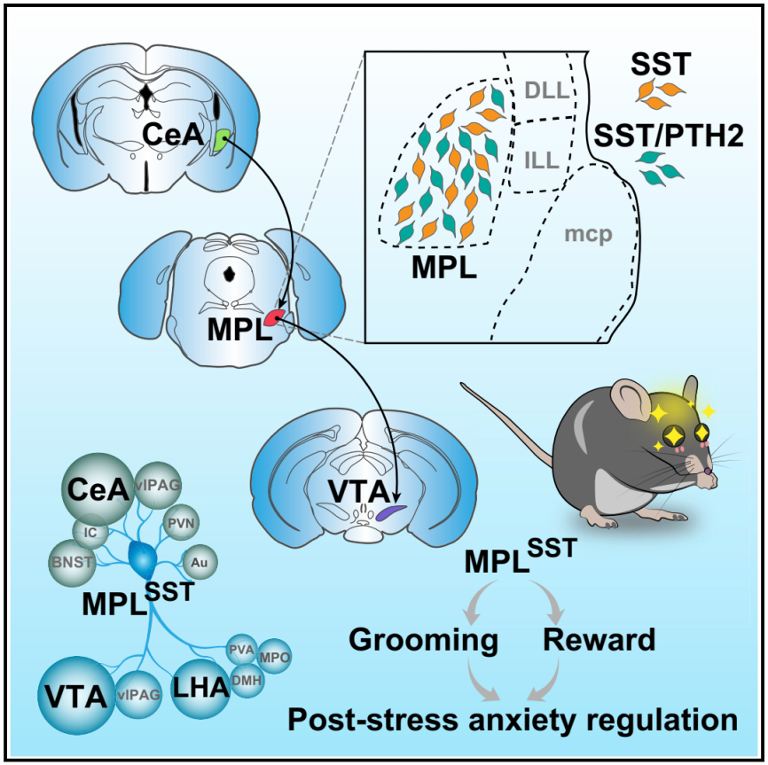 2022年9月6日,上海交通大学医学院黄菊团队发现,内侧脑桥旁核(medial paralemniscal nucleus,MPL)中的兴奋性生长抑素神经元(somatostatin-positive neurons,SST)能够控制小鼠的刻板重复行为并编码奖赏,而抑制这群神经元会削弱小鼠应对压力刺激之后缓解焦虑的能力。成果以“Excitatory SST neurons in the medial paralemniscal nucleus control repetitive self-grooming and encode reward”为题发表于《Neuron》杂志。